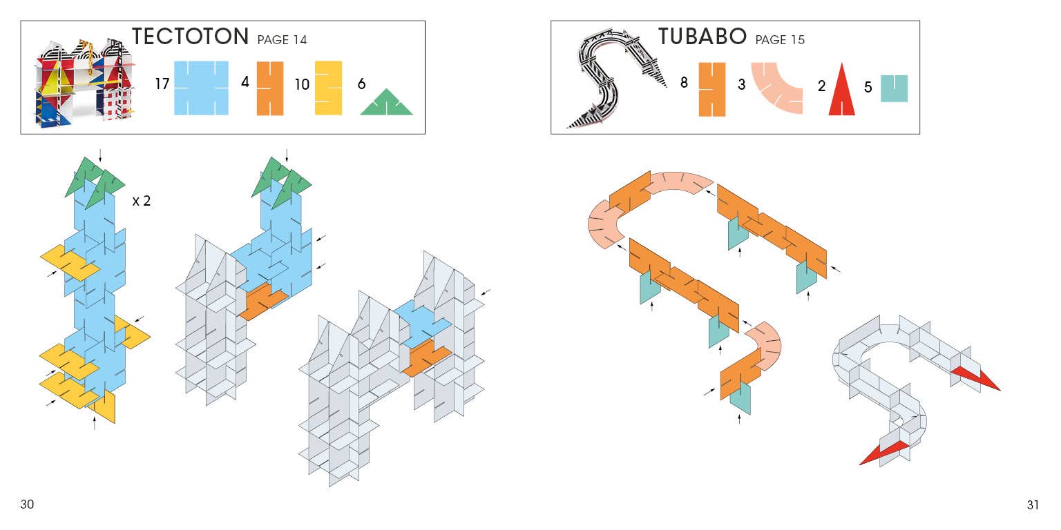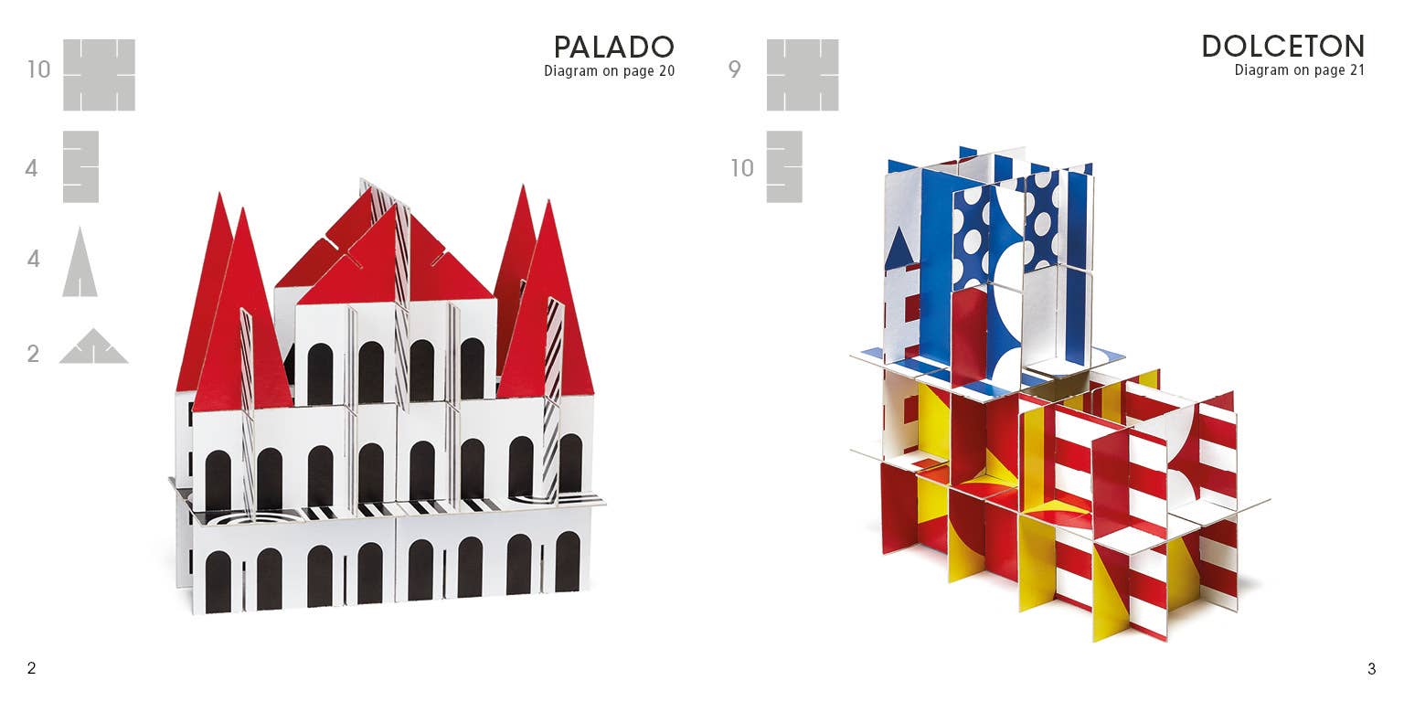 By Dominique Ehrhard. Early readers: ages 5–8. 5 1/16" x 5 1/8" x 2". 118 color & b/w images. An introduction to architectural creation, the 95 precut cardboard elements in this book can be combined in an infinite variety of ways to build all sorts of fantastical structures. Follow the full-color idea diagrams to create more than 20 unique projects, then disassemble them and try something different. Developing direction-following skills and 3-d creativity. Page count: 128.