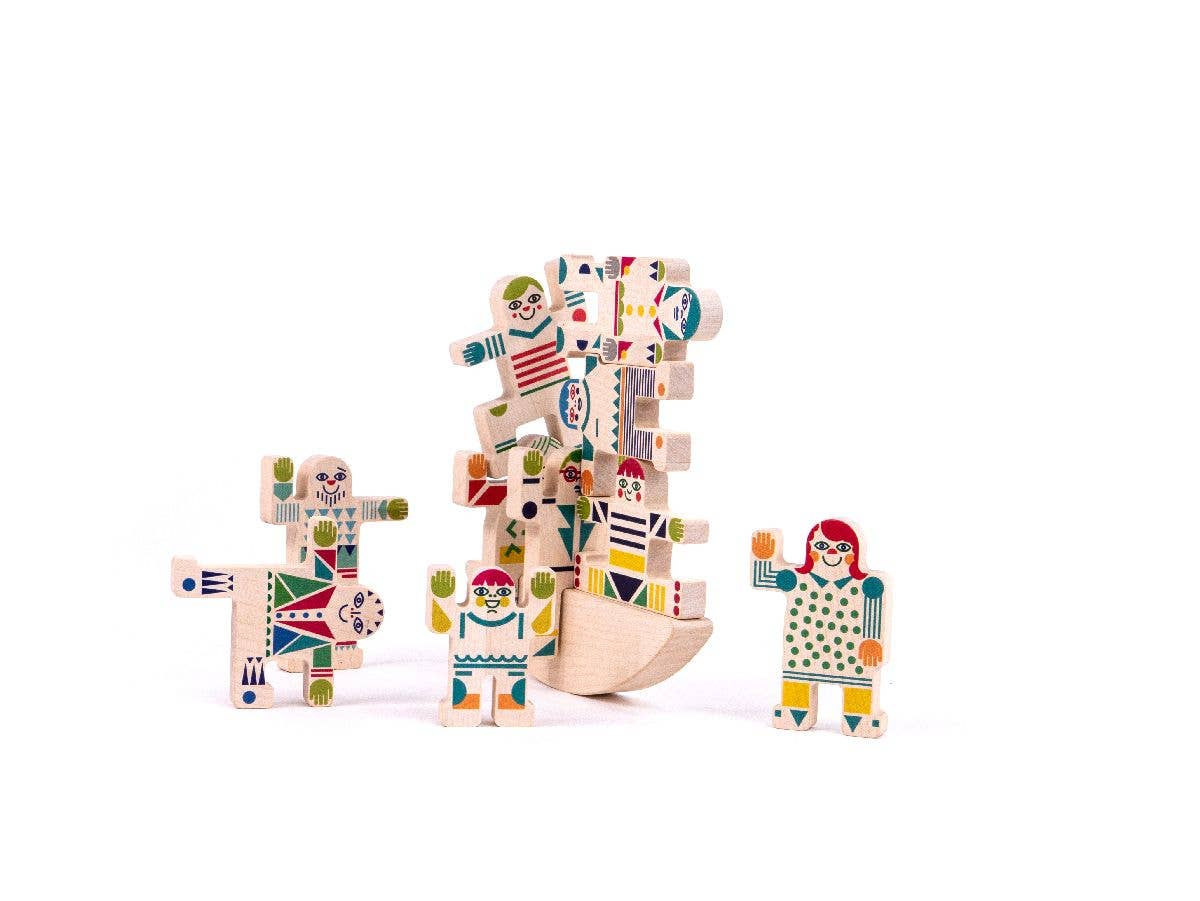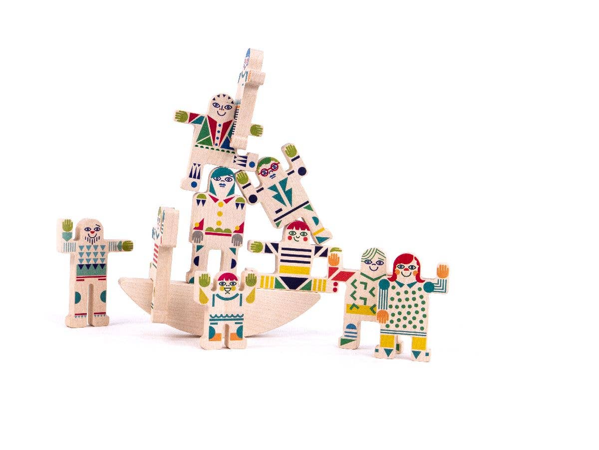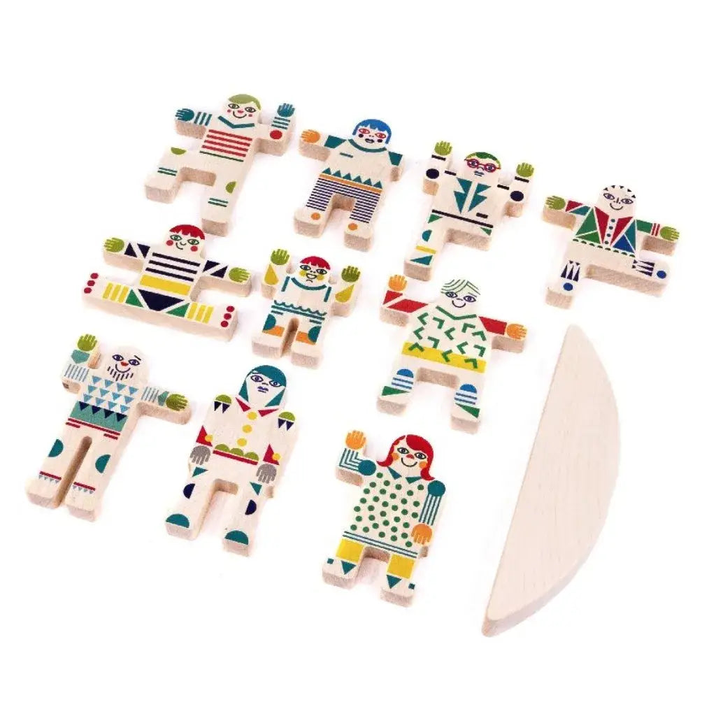 The set includes 10 wooden figures, each one colorful and unique. The figures are designed to be balanced on the semi-balancing platform, which provides a stimulating and challenging game for children to play. The figures are all different, with their own individual shapes and sizes, which makes the game even more interesting and engaging.