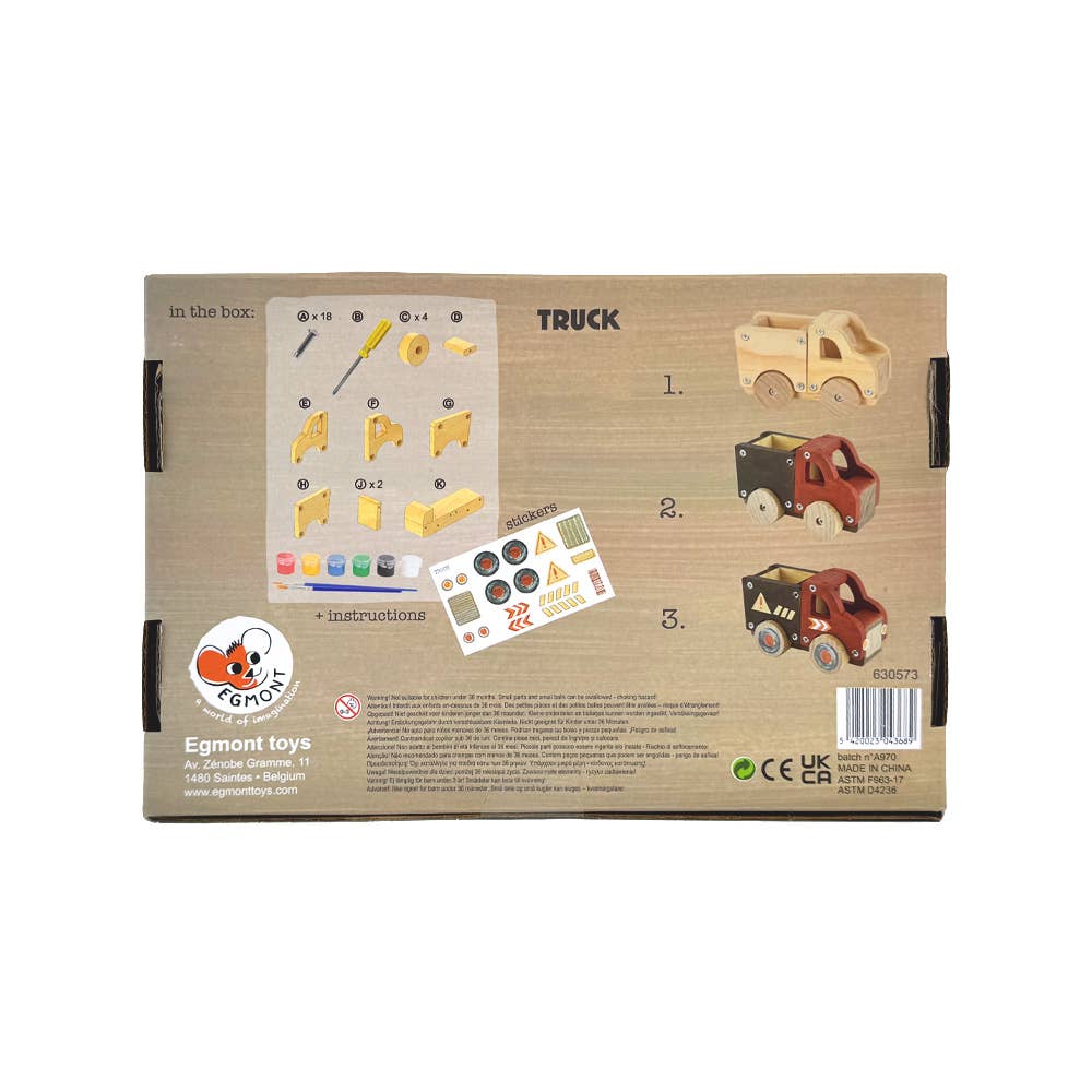 Build your own wooden truck and unleash your creativity! This all-in-one kit comes with everything you need to assemble, paint, and decorate your very own truck. Get ready to have hours of fun while developing fine motor skills and unleashing your imagination.