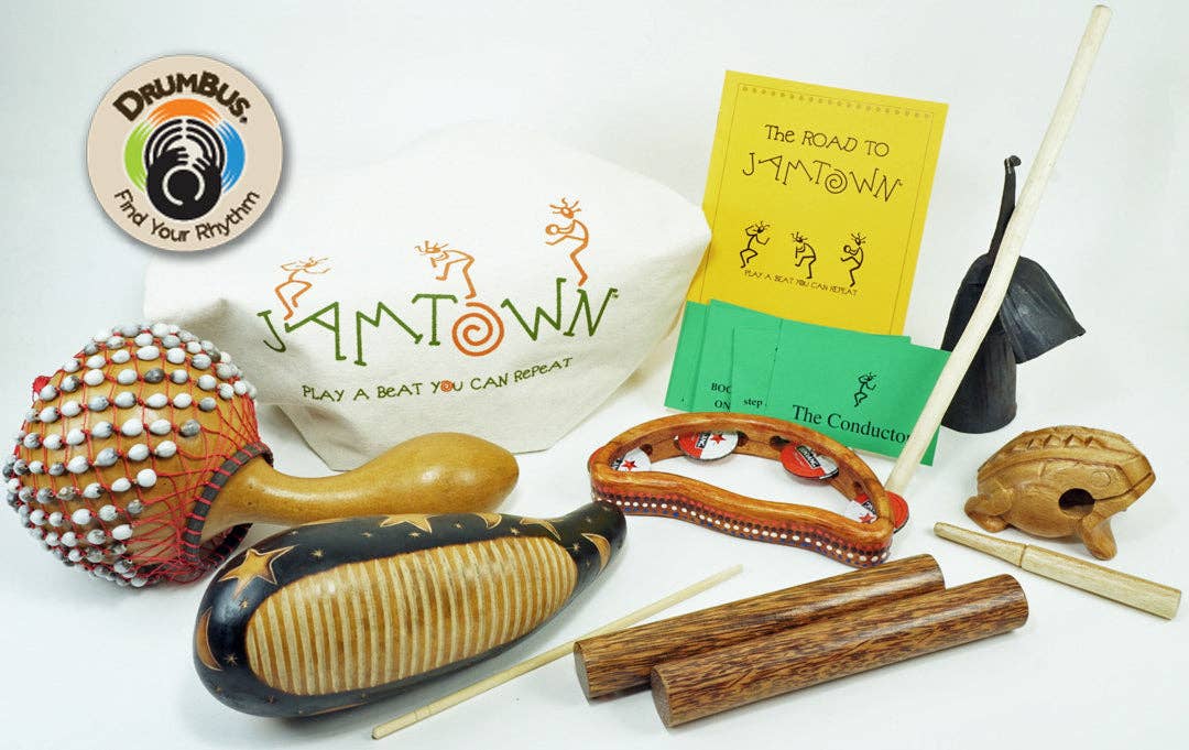 The DrumBus Rhythm Pack is ready to travel. Indonesia Tambourine, Clave Rhythm Sticks, Frog Wood Block: Ghana, Africa Double Agogo Bell, Shekere Shaker; Peru Gourd Scraper Guiro; Jamtown guide and cue cards, sturdy travel bag