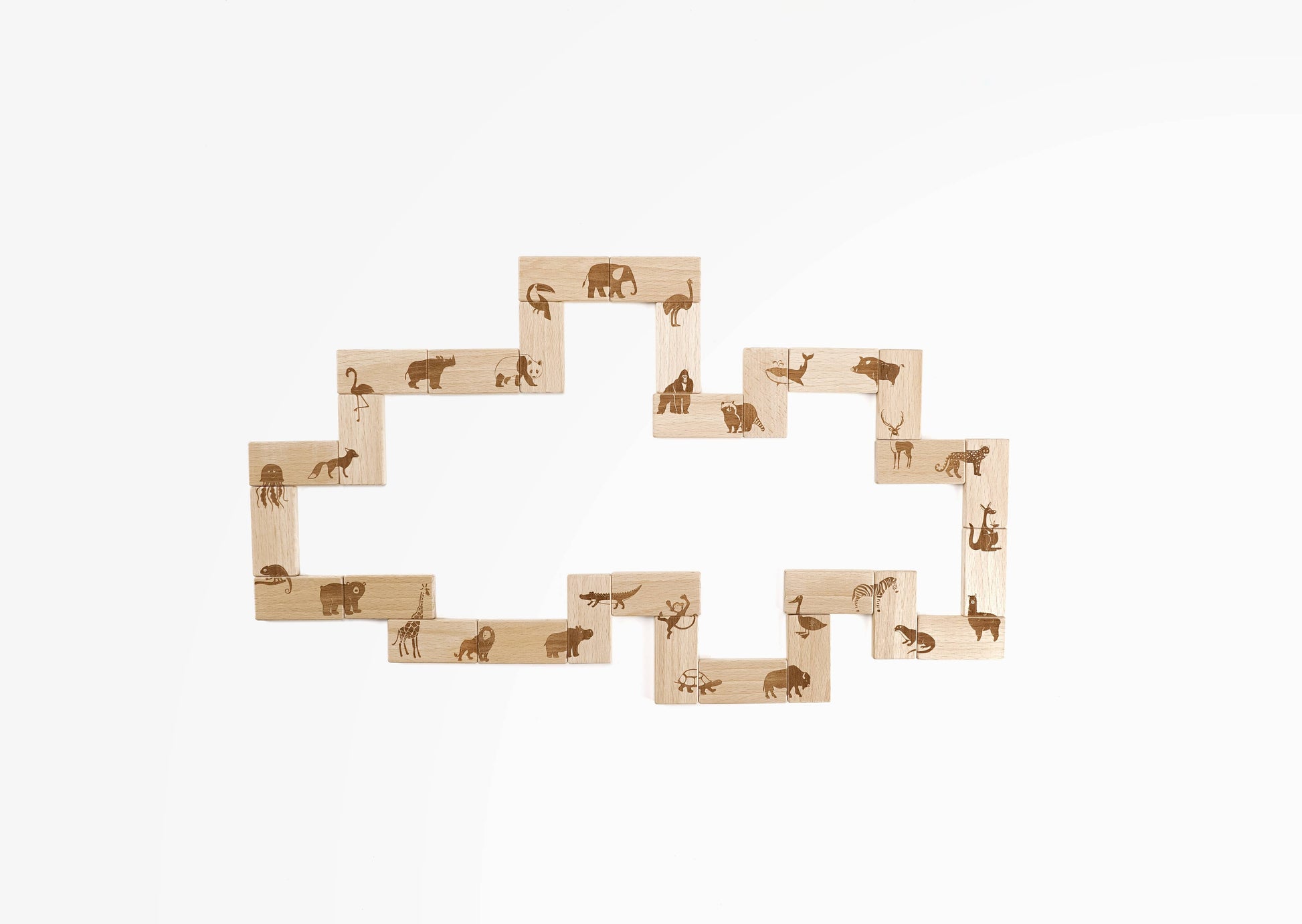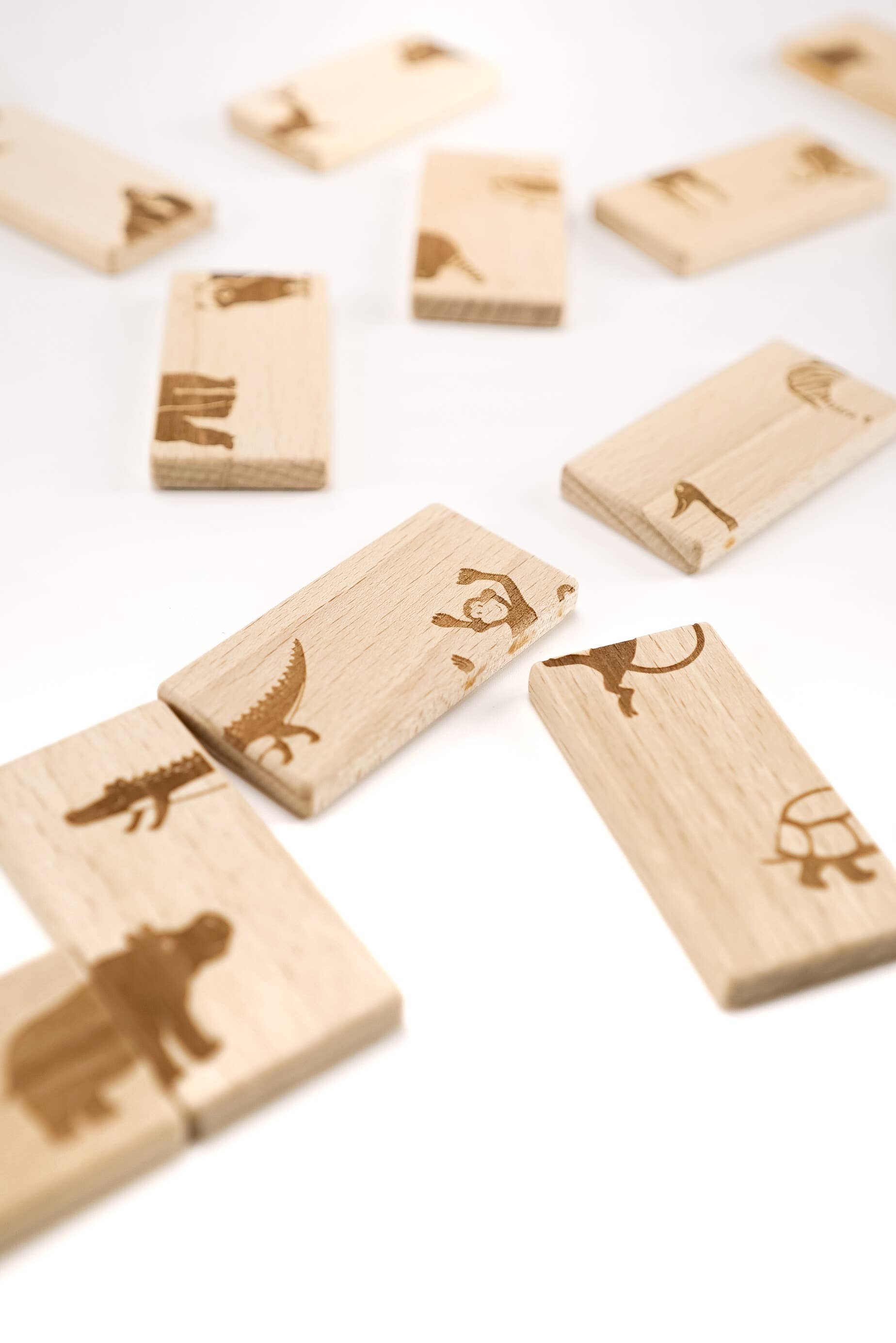 The set includes 28 wooden cards with detailed animals engraved.